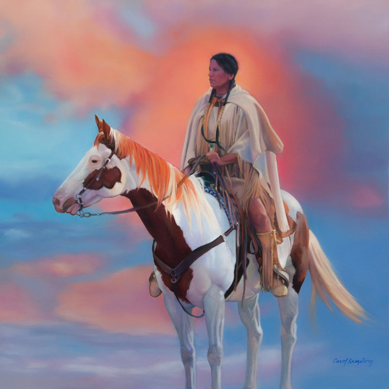 Listed in Who’s Who in American Art, she has been featured in the Norman Magazine, Norman Living Magazine and Art Gallery Magazine. She is known throughout the Western and Contemporary Art communities for her emotive figurative and landscape Oil paintings. Carol has shown in numerous Juried Art Shows throughout Oklahoma and Nationwide. She has been represented by numerous Galleries in Oklahoma, Santa Fe and Scottsdale. Her work is proudly collected by many including the Cherokee Nation. Carol has been an award winner at the Red Earth Festival and OKC Festival of the Arts for many years. One of her recent galleries shows was at The Red Earth Art Center Gallery called “The Horse’s Landscape”.