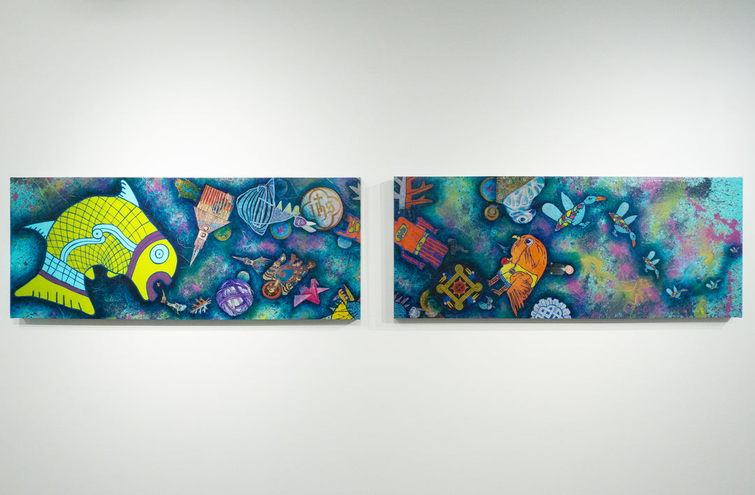 Erin Shaw is a painter of borderlands, the spaces between worlds. As a visual storyteller, the child of an Oklahoma farm, Shaw tills the rich soil of dichotomy through her masterful uses of color, iconography, and story. As a Chickasaw-Choctaw artist, she creates in a state of tension, suspended between two worlds where both solemnity and humor pervade her art. She finds that truths are revealed in unanticipated ways, and trickster often appears throughout her work. The artist earned her BFA in studio art from Baylor University and her MFA from the University of Oklahoma. She is Assistant Professor of Visual Arts at John Brown University in Siloam Springs, AR, an international speaker, and a featured artist in Visual Voices: Contemporary Chickasaw Art, among other exhibits in the U.S.