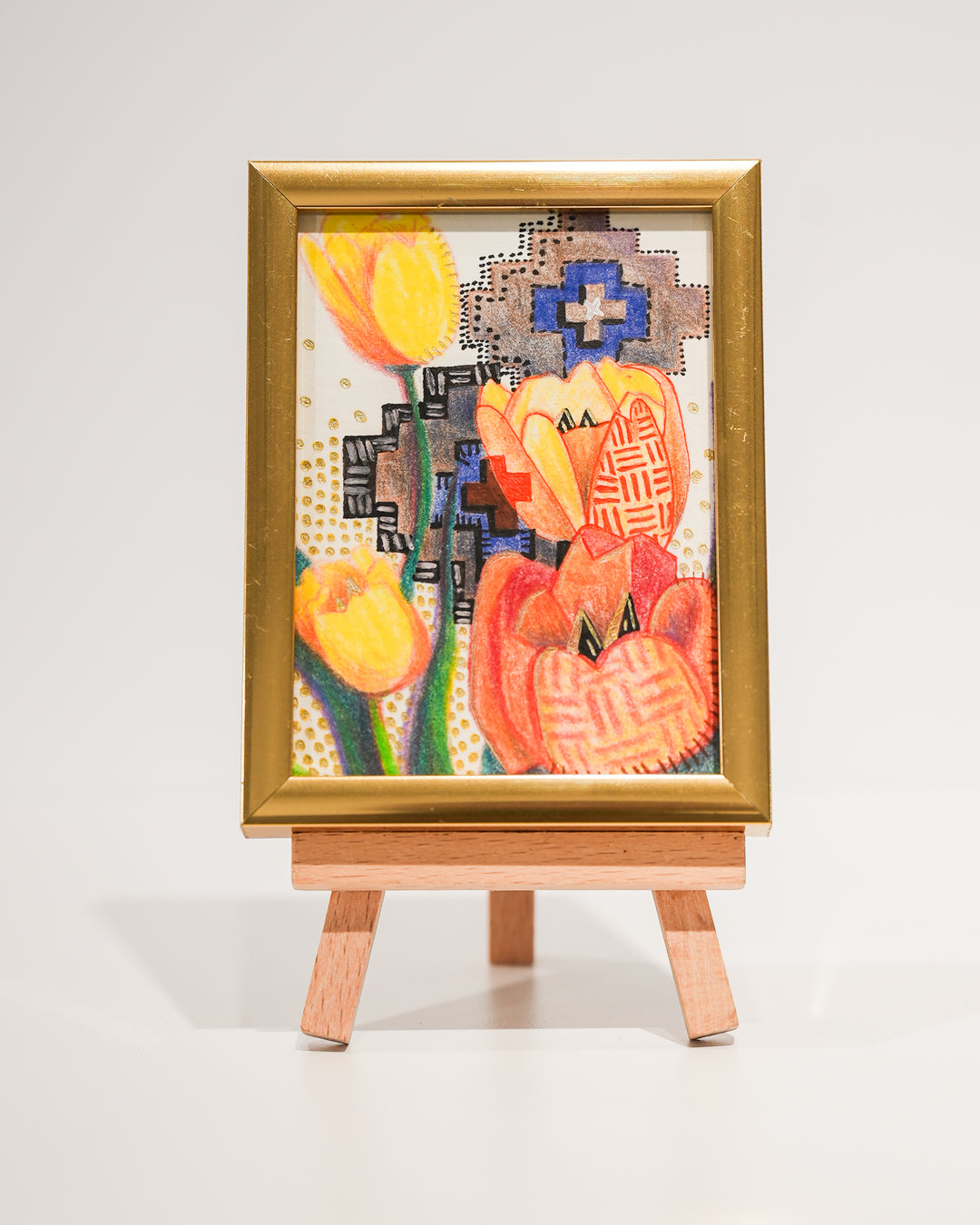 I illustrate personal narratives by inventing compositions driven by a theme or experience, translating them through the lens of abstracted patterns I’ve built out of my cultural research of Cherokee and other native arts. These personal illustrations are a hybrid of being culturally grounded, while also being far from native upbringing; a life influenced by various sources to the point of abstraction. There is a feel of beadwork or sewing, but the painting may contain neither. I view each piece I create as its own individual entity, yet all contributing to a visual language I am inventing. An aesthetic world that people of many cultural backgrounds can relate to or appreciate in some form.