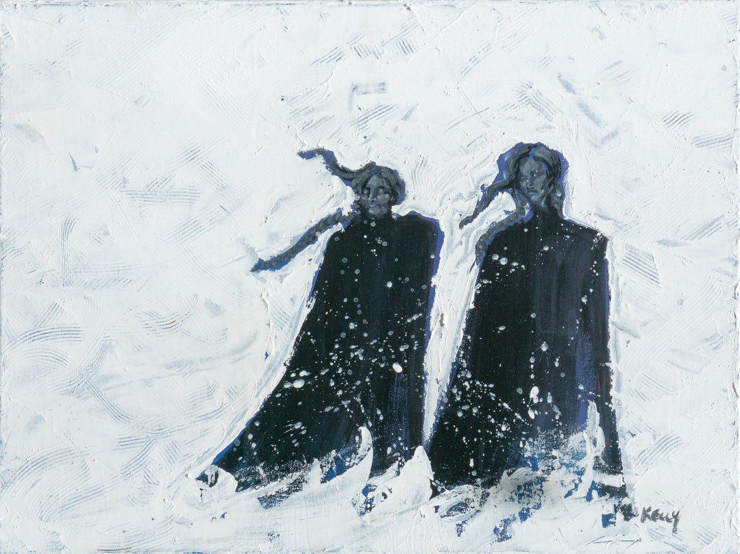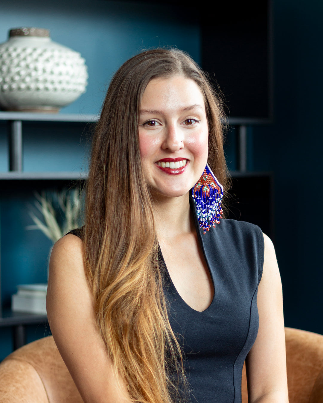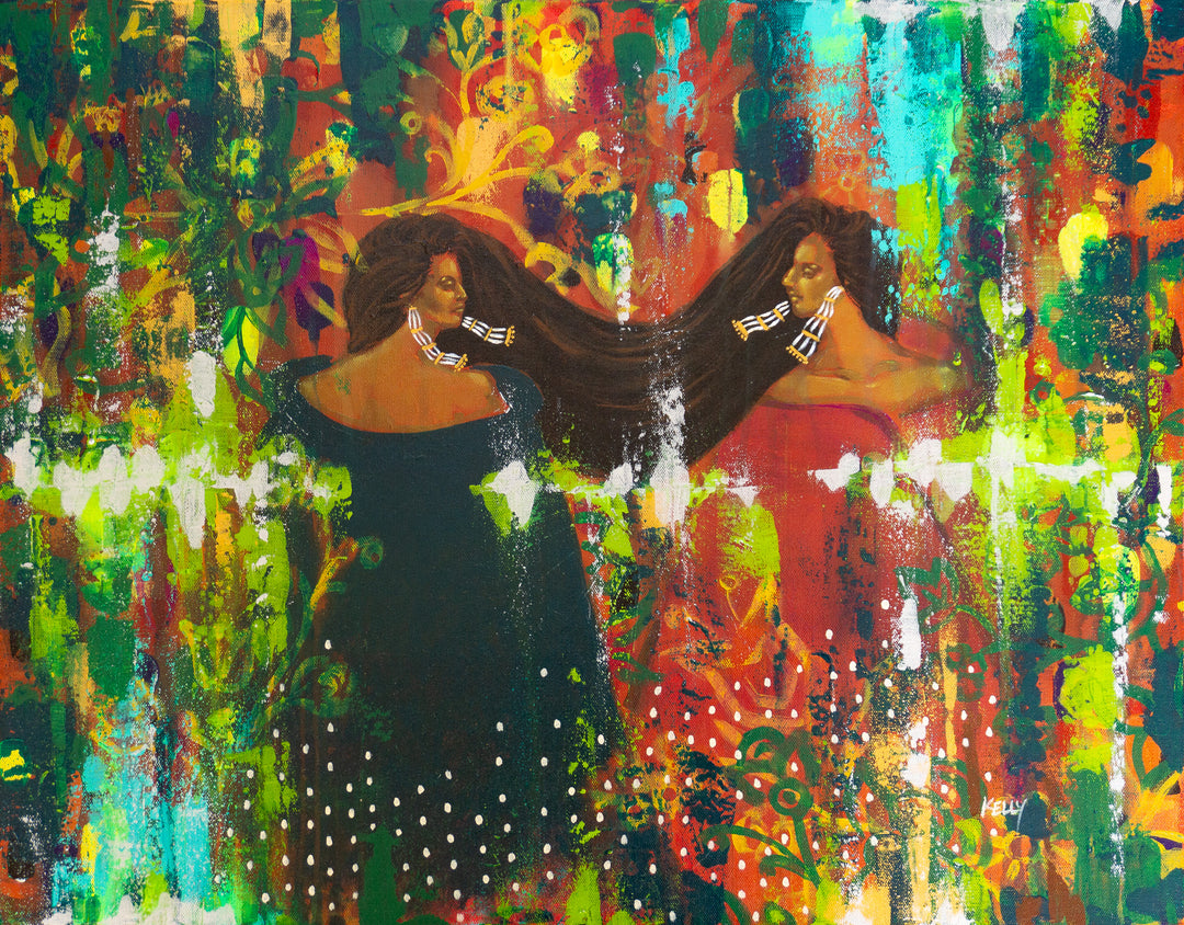 Lauren Kelly, born in 1994 in Norman, Oklahoma, is a Citizen Potawatomi artist currently based in Oklahoma. Specializing in acrylic painting, Kelly is best known for her distinctive style characterized by busy, asymmetrical deviations on traditional Potawatomi florals and dreamy, semi-surreal figures. Her work often explores themes of women and femininity, body autonomy, the interior of the human psyche, and ancestral connection.