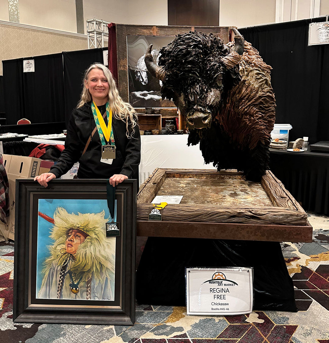 Regina Free is a citizen of the Chickasaw Nation. She was born and raised in Oklahoma, graduating high school from a small Green Country town, the home of Will Rogers and the Claremore Zebras. Her love of creating art and athletics lead her to pursue a Bachelor of Fine Arts degree at Oklahoma State University, graduating in 1997. During her college years, she played softball for the OSU Cowgirls and was presented with the Student-Athlete Academic Achievement Award with the distinction of Highest Merit.